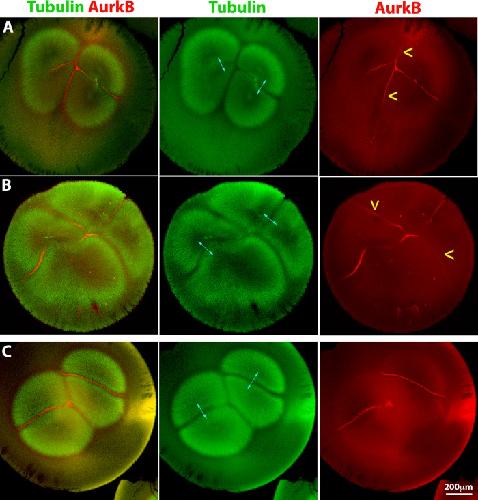 FIGURE 4:. Forced activation can recruit the CPC to interaction zones between nonsister asters. An activating anti-INCENP IgG was injected into polyspermic eggs 60–70 min postfertilization (after first mitosis). Sister asters in A–C are indicated by cyan double-headed arrows. (A) Bispermic egg fixed 90 min postfertilization. Note recruitment of CPC at similar levels to the interaction zones between sister and nonsister asters (CPC recruitment between nonsisters is highlighted by yellow arrowheads). Note that the aster morphology has been slightly distorted by the injection. (B) Bispermic egg fixed 98 min postfertilization. Same labeling convention as in A. CPC is recruited to interaction zones between nonsister asters. (C) Uninjected bispermic egg fixed at the same stage as A for comparison. CPC is not recruited between nonsister asters. |