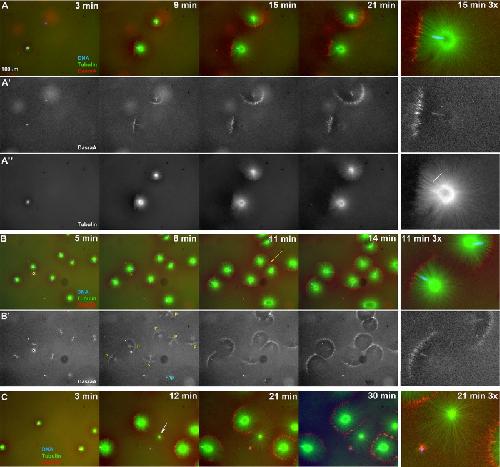 FIGURE 7:. Chromatin spatially biases CPC recruitment to monopolar sperm asters in egg extract. Permeabilized sperm was added to interphase egg extract supplemented with probes for DNA, tubulin, and the CPC (GFP-DasraA). (A–C) Image sequences chosen to emphasize different aspects of this reaction. The last in each series is a 3× magnification. Time points are as indicated. (A) Two isolated sperm asters. Note polarized microtubule distribution and formation of an arc of CPC-positive bundles on the periphery of each aster on the same side as the DNA. (A′) Only the DasraA channel for the same images as A. Note that the DasraA probe binds sperm chromatin. (A′′) Only the microtubule channel. (B) Field at higher sperm density. (B′) Same images in DasraA channel alone. Seven of eight of the asters polarize early (yellow p), and one aster never polarizes (cyan np). Later most asters contact a neighbor and form a CPC-positive interaction zone; yellow arrow at 11-min time point (B). (C) Field that includes a centrosome not attached to a sperm nucleus (white arrow in 12-min image). The centrosome nucleated a weaker aster than the sperm-attached centrosomes. The free centrosome aster did not recruit CPC to its periphery until it contacted a neighboring aster (30-min time point). The bright dot on the lower left side of the free centrosome aster is DNA without a centrosome. With regard to A–C, see Supplemental Movies 7A–7C, respectively. |