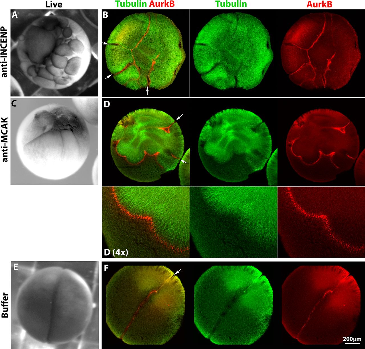FIGURE 3: Forced activation of the CPC induces ectopic furrows. Monospermic eggs were injected after first mitosis (60–70 min postfertilization) and time-lapse imaged to score cleavage (A, C, E), or fixed around the time of first cleavage and stained for tubulin and AurkB for CPC (B, D, F). (A, B) Injection with an activating anti-INCENP IgG. (A) Note multiple ectopic furrows. (B) Note ectopic microtubule assemblies with CPC strongly localized to their peripheries. Furrows initiated where CPC planes touched the cortex (white arrows). (C, D) Injection with inhibitory IgG to MCAK (Kif2C), the predominant microtubule catastrophe factor in frog eggs. (C) Note multiple ectopic furrows. (D) Note ectopic, CPC-positive microtubule assemblies and associated ectopic furrows (white arrows) as in B. (E, F) Injection with buffer only. A single cleavage furrow forms (E and white arrow in F). |