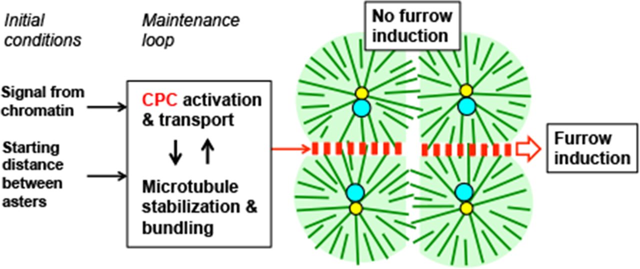 FIGURE 8:. Model illustrating results and hypothetical underlying mechanisms. The image illustrates the situation in a bispermic egg between first anaphase and first cleavage, similar to the cartoon in Figure 1 and the experimental examples in Figures 2C and 4C. Color coding and orientation of sister and nonsister aster pairs are as in Figure 1; red boxes indicate CPC and Centralspindlin complexes. The text boxes linked by arrows are factors we identified that control CPC recruitment and activation. We hypothesize that locally acting signals from chromatin (Figure 7) and the starting distance between asters (Figure 6) together provide an initial bias that promotes CPC recruitment between sister asters and are lacking between nonsister asters. We further hypothesize that CPC activation/recruitment (Figures 3–5) and microtubule bundling/stabilization (Figures 3 and 5) together constitute a positive feedback loop that promotes CPC retention on microtubule bundles and lateral spreading of CPC-positive bundles. These positive feedbacks allow a CPC-positive interaction zone to grow radially from the site previously occupied by the metaphase plate all the way to the cortex while retaining its CPC-positive state. |