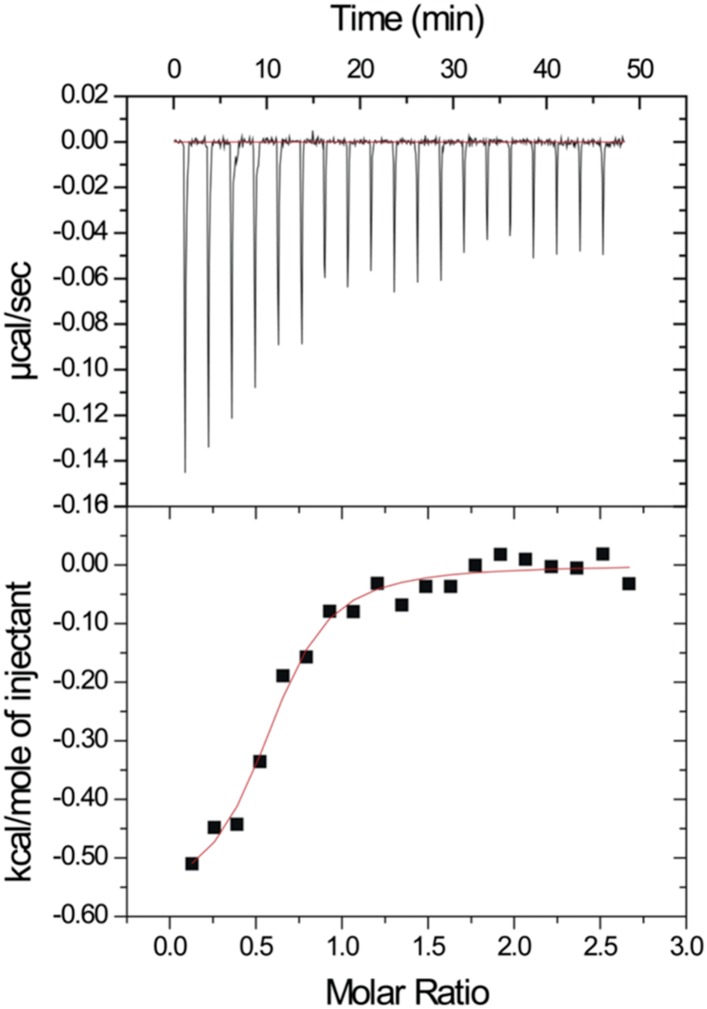 Figure 3. Isothermal titration calorimetry experiment.The MicroCal Auto-iTC-200 was used to obtain the binding affinity of Dvl-C peptide and Dvl PDZ protein in 50 mM phosphate buffer. The concentration of Dvl-C peptide in the syringe was 1.05 mM and the concentration of Dvl PDZ domain in the cell was 0.114 mM. The KD value was averaged from two independent experiments at 25°C.DOI: http://dx.doi.org/10.7554/eLife.08142.005 |