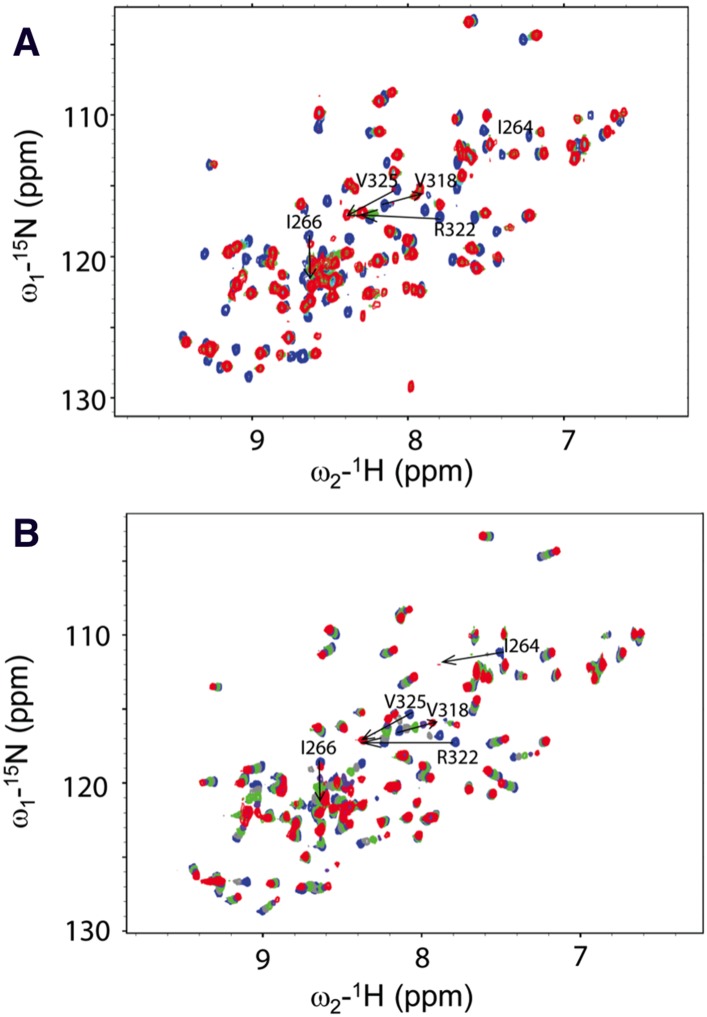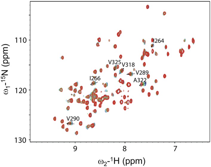Figure 5—figure supplement 1. The mutant Dvl-1 PDZ (R322A) domain binds more weakly than wild-type Dvl-1 PDZ domain to the Dvl-C peptide.Overlap of the 1H-15N HSQC spectra of the labeled mutant Dvl PDZ (R322A) domain and the Dvl-C peptide. The mutation dramatically weakens interaction with the Dvl-C peptide (free: blue; final titration: red; final peptide:protein ratio = 4:1).DOI: http://dx.doi.org/10.7554/eLife.08142.010 |