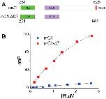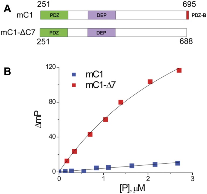 Figure 6. The binding pocket of the Dvl PDZ domain can be occupied by its intrinsic C-terminus.(A) Schematic representation of protein constructs mC1 (residues 251â695) and mC1-CÎ7 (residues 251â688) numbered according to the mouse Dvl-1 protein sequence. (B) Polarization change of the fluorescence-labeled peptide Rox-DprC (Rox-SGSLKLMTTV, derived from the C-terminus of Dpr) after addition of mC1-CÎ7 and mC1 proteins in 50 mM phosphate with 0.3 M NaCl and 6 mM β-mercaptoethanol. For the binding of Rox-DprC to mC1, KD is 3.8 ± 0.5 μM the value was obtained by fitting the titration data with the equation: ÎmP = ÎmPmax à [P]/([P] + KD), where ÎmP is the polarization change of Rox-DprC, [P] is the concentration of protein, and both KD and ÎmPmax are the fitting variables. For the binding of Rox-DprC to mC1-CÎ7, KD was estimated as 68 ± 5 μM. Because of the limitation in the titration study, to estimate the KD value, although we used the same equation to fit the titration data, in the fitting, Kd was the only variable and the maximum polarization change, ÎmPmax, was fixed to the value that was obtained in the titration study of Rox-DprC binds to mC1-CÎ7.DOI: http://dx.doi.org/10.7554/eLife.08142.011 |