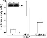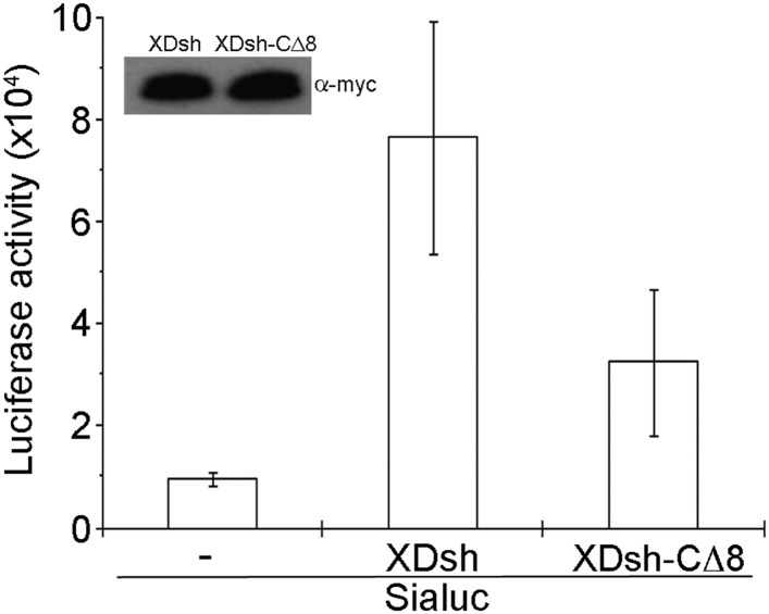 Figure 7. Effect of wild-type XDsh and XDsh-CΔ8 activity on canonical Wnt signaling.Luciferase assay using a Siamois promoter reporter (Sialuc). Sialuc DNA (200 pg) was injected alone or with myc-tagged Xdsh or Xdsh-CΔ8 mRNA (500 pg) into the animal pole region of 2-cell Xenopus embryos. Ectodermal explants were dissected at the early gastrula stage for luciferase assay. Values are the means ±SD from four independent experiments (p < 0.05). Inset shows a representative western blot using anti-myc antibody (9E10) to control for XDsh and XDsh-CΔ8 protein expression in the four experiments.DOI: http://dx.doi.org/10.7554/eLife.08142.012 |