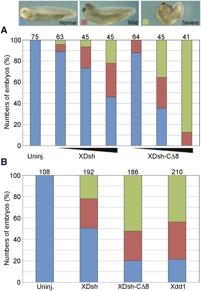 Figure 8. The open conformation of Dvl significantly enhances gain-of-function planar cell polarity (PCP) signaling.(A) Xenopus embryonic abnormal convergent extension (CE) phenotypes induced by injection of wild-type XDsh and XDsh-CÎ8 mRNA at three increasing concentrations (arrows at bottom represent 80 pg, 200 pg and 500 pg of injected mRNA; above are numbers of embryos injected from two independent experiments). Phenotypes are severe (green), mild (red), and normal (blue). (B) Comparison of phenotypes induced by dose-equivalent injections (500 pg mRNA) of XDsh, XDsh-CÎ8, and Xdd1 (a well-established dominant-negative XDsh mutant). XDsh-CÎ8 and Xdd1 induced similar phenotypes. The numbers of embryos injected from three independent experiments are listed on the top of each column.DOI: http://dx.doi.org/10.7554/eLife.08142.013 |