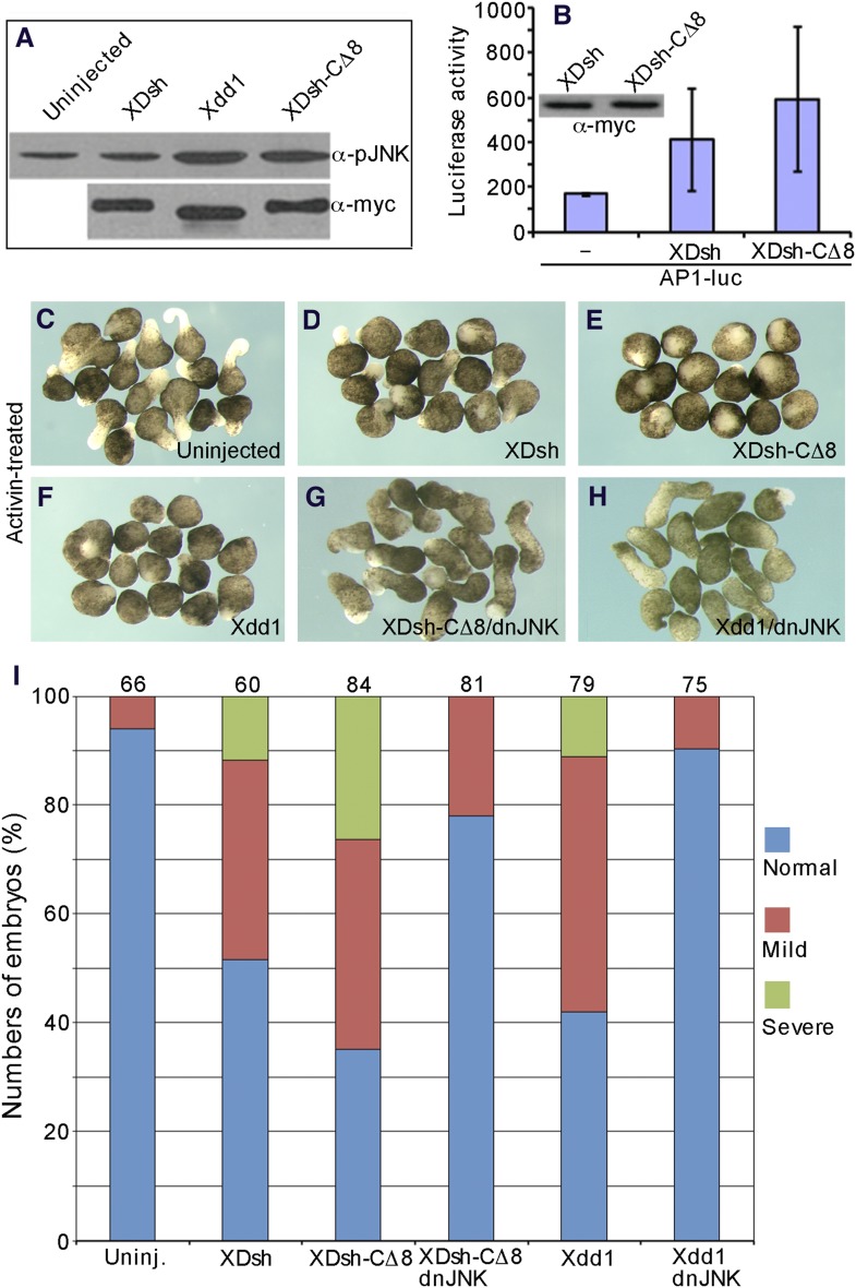 Figure 9. The open conformation of Dvl disrupts CE by activating Jun N-terminal kinase (JNK).(A) Western blot of phosphorylated JNK in ventral mesoderm cells overexpressing wild-type XDsh or its mutants. At equivalent protein level, Xdd1 and XDsh-CÎ8 more potently induce JNK phosphorylation than wild-type XDsh. (B) Xenopus 4-cell stage embryos were dorsally coinjected with equal quantities of wild-type XDsh mRNA or XDsh-CÎ8 mRNA (500 pg) and the AP1-luciferase reporter DNA (200 pg); luciferase activity was assayed at the late gastrula stage. Inset shows a representative Western blot using anti-myc antibody to control XDsh and XDsh-CÎ8 protein levels. Values are the mean and SD from three independent experiments (XDsh vs XDsh-CÎ8, p < 0.05). (CâH) The dominant negative JNK mutant (dnJNK) rescues activin-induced explant elongation blocked by overexpression of XDsh-CÎ8 or Xdd1. (C) Uninjected explants treated with activin show extensive elongation. (D) XDsh-injected explants treated with activin show moderate inhibition of explant elongation. (E) Injection of XDsh-CÎ8 strongly inhibits explant elongation. (F) Injection of Xdd1 similarly inhibits explant elongation as injection of XDsh-CÎ8. (G, H) dnJNK rescues explant elongation inhibited by XDsh-CÎ8 or Xdd1. (I) dnJNK also recues CE defects produced by overexpression of XDsh-CÎ8 or Xdd1 in whole embryos. Phenotypes are severe (green), mild (red), and normal (blue). Numbers on the top indicate total embryos scored from three independent experiments.DOI: http://dx.doi.org/10.7554/eLife.08142.014 |