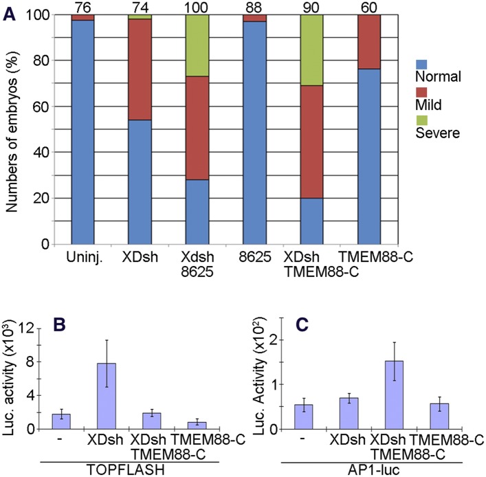Figure 10. The open conformation of Dvl induced by targeting the Dvl PDZ domain potentiates Wnt/JNK signaling.(A) Regulation of XDsh-mediated PCP signaling by a PDZ-binding small molecule or peptide is shown by the gain-of-function CE phenotypes of whole embryos that were uninjected (controls) or injected with XDsh mRNA with or without treatment with the Dvl inhibitors 3209–8625 or coinjected with XDsh and TMEM88-C mRNAs. (B) Inhibiting the Dvl PDZ domain blocks canonical Wnt signalling induced by Dvl overexpression. Wild-type XDsh mRNA was injected alone or coinjected with an equal quantity of TMEM88-C mRNA in the animal pole region of two-cell stage Xenopus embryos, and ectodermal explants were dissected at the late blastula stage. TOPFLASH luciferase activity values are the mean and SD from three independent experiments (p < 0.05). (C) Inhibition of the Dvl PDZ domain by TMEM88 opens the conformation of Dvl and potentiates Wnt/JNK signaling induced by Dvl overexpression. Xenopus 4-cell stage embryos were injected dorsally with wild-type XDsh mRNA or coinjected with equal quantities of wild-type XDsh mRNA and TMEM88-C mRNA. AP1 luciferase activity was assayed at the late gastrula stage. Values are the mean and SD from three independent experiments (p < 0.05).DOI: http://dx.doi.org/10.7554/eLife.08142.015 |