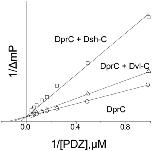 Figure 2. Competitive binding experiments.The KD value of the fluorescence-labeled Dapper (Dpr)-derived peptide Rox-DprC was obtained by plotting 1/ΔmP vs 1/[PDZ], where ΔmP is the fluorescence polarization change (×1000) of Rox-DprC and [PDZ] is the concentration of the PDZ domain of Dvl. The KI values of the Dvl-C and Dsh-C peptides were obtained by using the equation KDapp = (KD/(1 + [I]/KI)).DOI: http://dx.doi.org/10.7554/eLife.08142.004 |