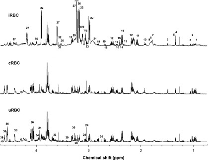1H-NMR metabolite profiles of different strains of Plasmodium falciparum.