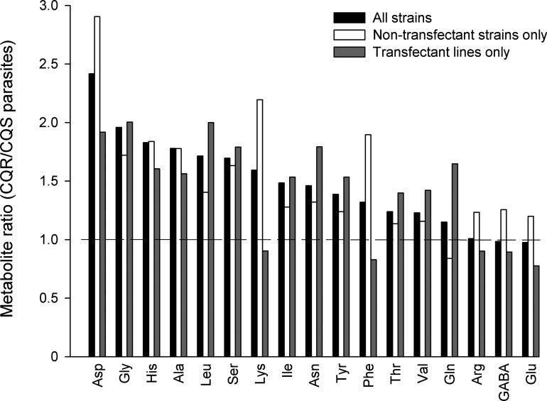 Although efforts to understand the basis for inter-strain phenotypic variation in the most virulent malaria species, Plasmodium falciparum, have benefited from advances in genomic technologies, there have to date been few metabolomic studies of this parasite. Using 1H-NMR spectroscopy, we have compared the metabolite profiles of red blood cells infected with different P. falciparum strains. These included both chloroquine-sensitive and chloroquine-resistant strains, as well as transfectant lines engineered to express different isoforms of the chloroquine-resistance-conferring pfcrt (P. falciparum chloroquine resistance transporter). Our analyses revealed strain-specific differences in a range of metabolites. There was marked variation in the levels of the membrane precursors choline and phosphocholine, with some strains having >30-fold higher choline levels and >5-fold higher phosphocholine levels than others. Chloroquine-resistant strains showed elevated levels of a number of amino acids relative to chloroquine-sensitive strains, including an approximately 2-fold increase in aspartate levels. The elevation in amino acid levels was attributable to mutations in pfcrt. Pfcrt-linked differences in amino acid abundance were confirmed using alternate extraction and detection (HPLC) methods. Mutations acquired to withstand chloroquine exposure therefore give rise to significant biochemical alterations in the parasite.