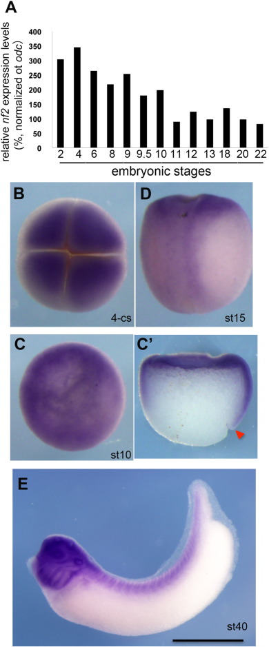 Fig. 1. Expression pattern of nf2 in early Xenopus laevis development. (A) qPCR analysis of nf2 mRNA expression in the different stages of early development. The relative expression of nf2 mRNA was normalized to that of odc. (BâE) Embryos at different stages in situ hybridized with nf2. (B) 4-Cell stage, animal view. (C) Early gastrula (st10), animal view. (Câ²) Early gastrula viewed from a bisection surface, dorsal to right, red triangle points to dorsal lip. (D) Early neural stage (st15), dorsal view. (E) Stage 40, lateral view. Scale bar: 1 mm.