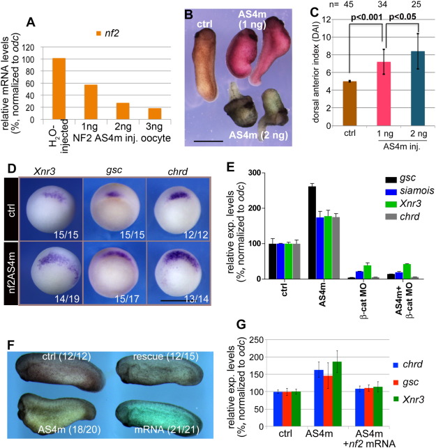 Fig. 2. Depletion of maternal NF2 results in dorsanteriorized development. (A) qPCR analysis for nf2 in oocytes injected with water or different doses of antisense oligo AS4m targeting Xenopus nf2. The relative expression of nf2 mRNA was normalized to that of odc. (B) Early tailbud embryos obtained through fertilizing oocytes injected with water (brown), 1 ng AS4m (red), or 2 ng AS4m (blue) via host transfer techniques. (C) A dorsal anterior index (DAI) scoring of the control and maternal NF2-depleted embryos at the early tailbud stage as shown in (B). The numbers of embryos with the indicated treatment are shown on the top of each histogram. p-Values were obtained by the student t-test. (D) Embryos at stage 10.5 in situ hybridized with organizer genes. All embryos are viewed from vegetal pole with dorsal side upwards. (E) qPCR comparison of organizer genes, gsc, siamois, Xnr3, and chrd in control, AS4m-injected, β-catenin MO-injected, and AS4m + β-catenin MO-injected embryos at stage 10.5. (F) Tailbud stage embryos showing AS4m-caused dorsanteriorization could be partially rescued by reintroducing nf2 mRNA. (G) qPCR analysis for organizer genes in the control, AS4m-injected, and AS4m + nf2 mRNA-injected embryos at stage 10.5.