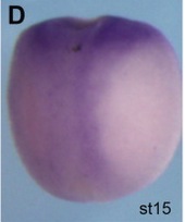 nf2 (NF2, moesin-ezrin-radixin like (MERLIN) tumor suppressor) gene expression in Xenopus laevis embryo, assayed via in situ hybridization, NF stage 10, (C) dorsal view, anterior up. (C') in midsagittal section, dorsal right.
