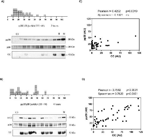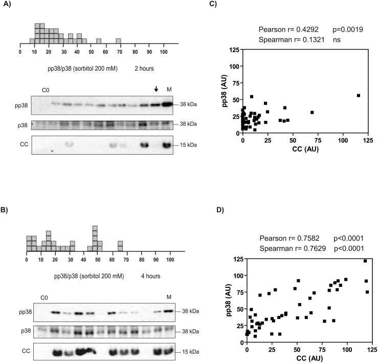 Fig 4. Bimodal and time-dependent response of the p38 system to hyperosmolar sorbitol.(A) Oocytes were incubated with 200 mM sorbitol for 2 h and pp38, p38, and cytochrome c (CC) were measured by Western blot in individual oocytes. p38 activity is represented as pp38/p38 ratio, taking as maximum activity (100% value) the oocytes treated with 400 mM sorbitol (M). Each box represents one individual oocyte. Results are the pool of three independent experiments. The Western blot shows a representative experiment. The arrow indicates no correlation between p38 activation and cytochrome c release at 2 h. (B) p38 activity in individual oocytes treated with 200 mM sorbitol for 4 h. Activity was measured by Western blot, as described previously, and the results expressed as pp38/p38, taking as maximum activity the value obtained with 400 mM sorbitol. (C) Correlation between pp38 and cytochrome c in oocytes incubated with 200 mM sorbitol for 2 h. pp38 and cytochrome c (CC) levels were determined by Western blot in individual oocytes (n = 50) from 5 independent experiments, giving 100% value to individual oocytes treated with 400 mM sorbitol. The data obtained for each oocyte was represented graphically and the correlation coefficient (Pearson r, Spearman r) calculated with GraphPad Prism4. (D) Correlation between pp38 and cytochrome c in oocytes incubated with 200 mM sorbitol for 4 h. pp38 and cytochrome c (CC) were determined by Western blot in individual oocytes (n = 50) as reported before, the data obtained represented graphically, and the correlation coefficients calculated with GraphPad Prism4.