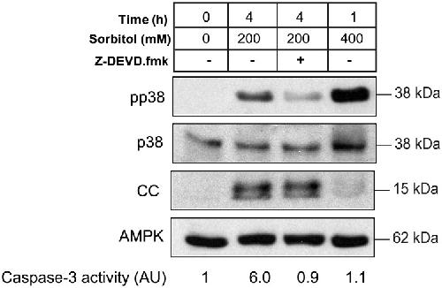 Fig 6. Caspase-3 inhibitor reduces p38 phosphorylation induced by hyperosmotic shock.Oocytes were incubated with 200 mM sorbitol for 4 h in the presence or absence of caspase-3 inhibitor Z-DEVD.fmk (50 μM), or with 400 mM sorbitol for 1 h. Pools of 20 oocytes were collected and pp38, p38, cytochrome c (CC) and AMPK (loading control) were analyzed by Western blot. Caspase-3 activity was determined as the concentration of fluorescent AMC formation from Z-DEVD-AMC substrate, and represented as arbitrary units of caspase-3 activity, giving value 1 to non treated oocytes.