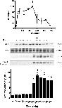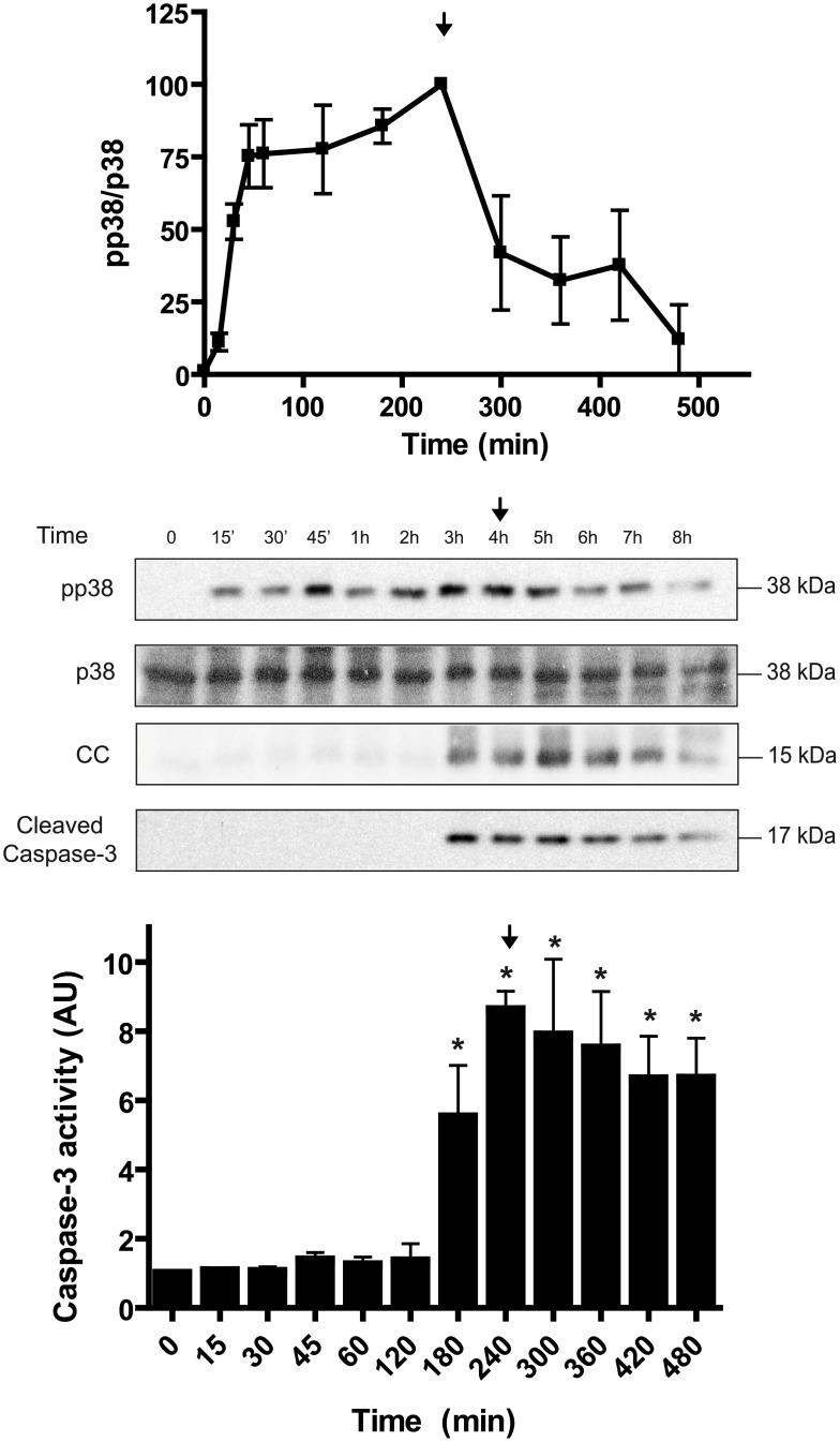 Fig 3. Monostability in the p38 signaling system.Time course of p38 activation in oocytes treated with 300 mM sorbitol. After 4 h of treatment (arrow), oocytes were washed several times with MBS and maintained in MBS without sorbitol. Pools of 20 oocytes were collected at different times to determine pp38, p38, cytochrome c (CC), and cleaved caspase-3 by Western blot. p38 activity is represented as pp38/p38 ratio, given 100% value to the highest activity. Results are represented as mean ± SEM of three independent experiments. A representative Western blot is shown. Caspase-3 activity was determined as reported before. Data are represented as mean ± SEM (n = 3), *p<0.05 (ANOVA and Dunnett’s test) comparing with non treated oocytes.