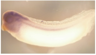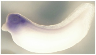 fbxo46 (F-box protein 46) gene expression in Xenopus laevis embryo, assayed via in situ hybridization, NF stage 30, lateral view, anterior left, dorsal up. |