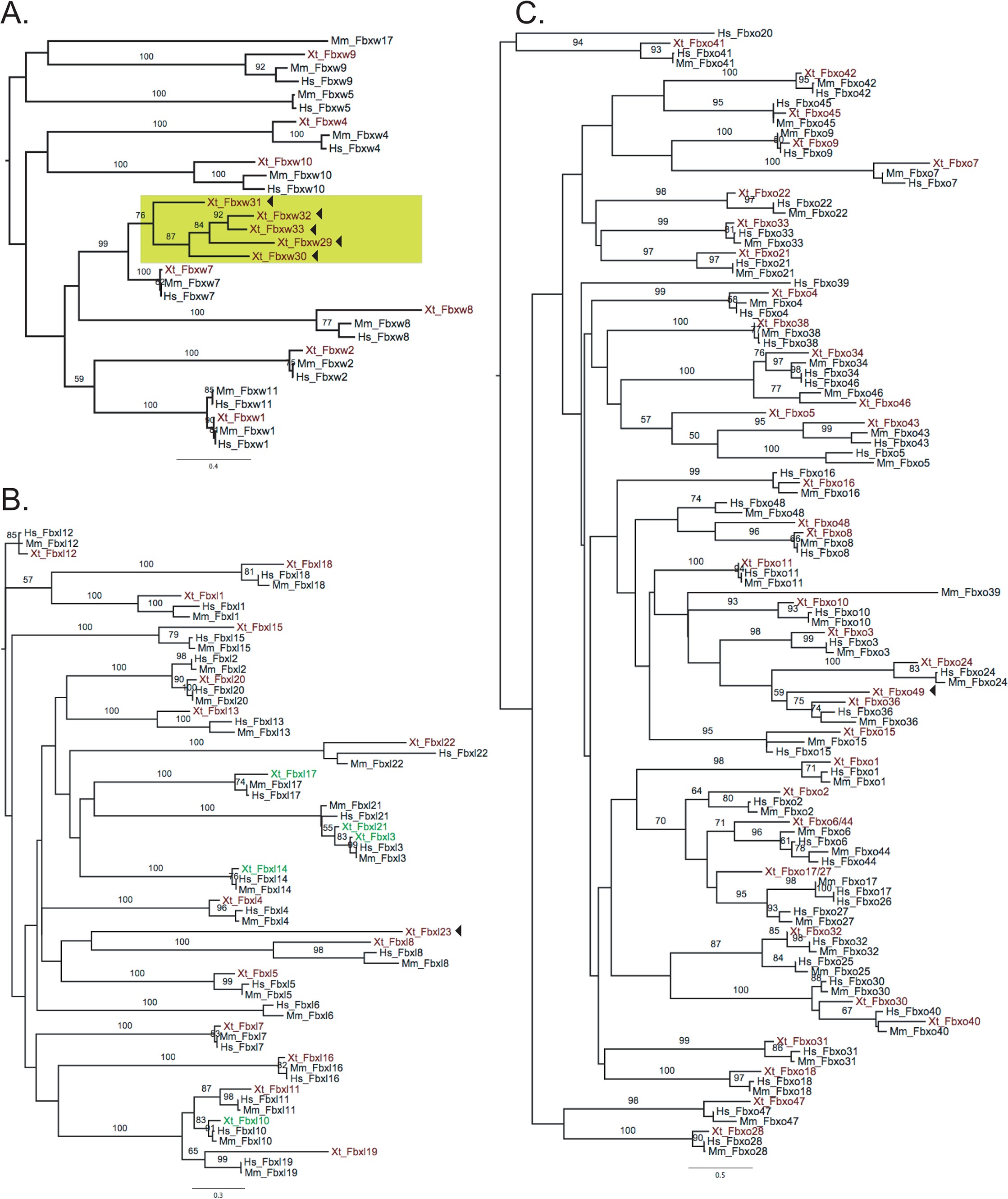 Full-length protein sequences of F-box proteins categorized into subgroups were used to construct maximum likelihood phylogenies; A. F-box proteins with WD40 repeats (Fbxw), B. F-box proteins with leucine rich repeats (Fbxl), and C. F-box proteins with other domains (Fbxo). A Xenopus F-box protein (red) is considered homologous if it clusters with mammalian proteins. Green shaded branch shows Xenopus specific Fbxw7-like genes. Xenopus Fbxl sequences in green lack an identifiable LRR domain but are found to be highly associated with Fbxl proteins (see S1 Fig). Bootstrap values higher than 50 are shown. Arrowheads show X. tropicalis specific F-box proteins.