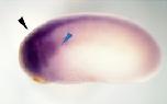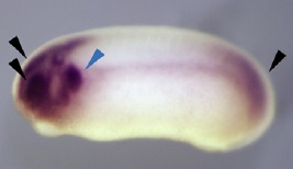 fbxl19 (F-box and leucine-rich repeat protein 19) gene expression in Xenopus laevis embryo, assayed via in situ hybridization, NF stage 26, lateral view, anterior left, dorsal up. |