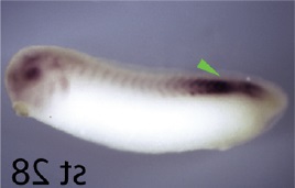 fbxo28 (F-box protein 28) gene expression in Xenopus laevis embryo, assayed via in situ hybridization, NF stage 26, lateral view, anterior left, dorsal up. |