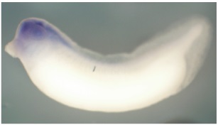 fbxo11 (F-box protein 11) gene expression in Xenopus laevis embryo, assayed via in situ hybridization, NF stage 30, lateral view, anterior left, dorsal up. |