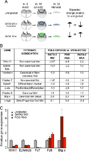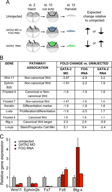 Fig. 2. Microarray approach to identify ectodermal GATA2 targets required for blood formation in the mesoderm. (A) Schematic of microarray strategy and sample acquisition. Embryos were injected at the two-cell stage with GATA2 MO (40 ng), FOG RNA (500 pg) or GATA2 RNA (500 pg) and cultured to the early gastrula stage (stage 10). Ectoderm was explanted and cultured to stage 12, at which point ectodermal explants in each group were pooled and RNA was extracted for microarray analysis. (B) Genes identified by microarray analysis that are predicted to be relevant for hematopoiesis (C) qPCR analysis of gene expression in ectodermal explants isolated at stage 10 from embryos injected with GATA2 MOs or FOG RNA and cultured to stage 12. Quantification of relative gene expression (mean±SD) in three independent experiments is shown. |