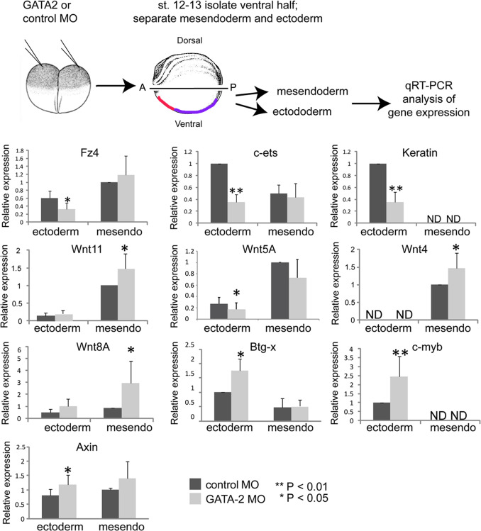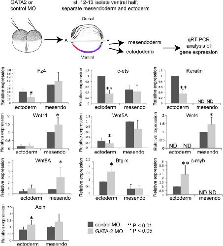 Fig. 3. GATA2 regulates expression of Wnt pathway components and target genes during gastrulation. GATA2 or control MO (40 ng per embryo) was injected into two-cell embryos. At stage 12â13, the ventral half of the embryo was removed as illustrated and dissected into ectodermal or mesendodermal pieces. The location of cells that will give rise to the anterior VBI (red) and posterior VBI (purple) is indicated. RNA was extracted from pooled ectoderm or mesendoderm (mesendo) and gene expression analyzed by qPCR for each target gene. Quantification of relative gene expression (mean±SD) in at least three independent experiments is shown. |
