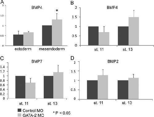 Fig. 4. GATA2 is not required for expression of Bmp2, Bmp4orBmp7during gastrulation. (A) GATA2 or control MOs (40 ng per embryo) were injected into two-cell embryos. At stage 13, the ventral half of the embryo was removed and dissected into ectodermal or mesendodermal pieces that were analyzed for expression of Bmp4 by qPCR. Quantification of relative gene expression (mean±SD) in four independent experiments is shown. (BâD) GATA2 or control MOs were injected into two-cell embryos and expression of Bmp4, 7, and 2 was analyzed by qPCR in whole embryos at stage 11. Quantification of relative gene expression (mean±SD) in three independent experiments is shown. |