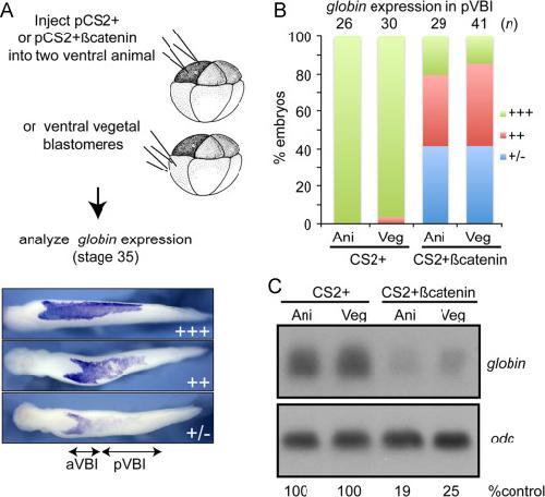 Fig. 6. Upregulation of zygotic canonical Wnt signaling in either ectodermal or mesodermal cells disrupts primitive erythropoiesis. (A and B) Empty CS2+vector DNA or CS2+Ãcatenin DNA (100 pg per blastomere) was injected into both ventral animal pole or vegetal pole cells of 8-cell embryos as illustrated and expression of globin was analyzed by WMISH at stage 34. Globin staining in the posterior VBI (pVBI) of experimental embryos was scored as barely or not detectable (â/+), moderately decreased (++) or strong (+++) using the scale illustrated in panel A. (C) Embryos were injected as illustrated in panel A and expression of globin was determined by Northern blotting at stage 34. Levels of globin transcripts are normalized to and reported as a percentage of globin levels in CS2+ embryos below each lane. Results shown were replicated in one additional experiment. |
