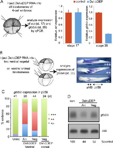 Fig. 7. Non-canonical Wnt signaling is required in ectodermal and mesodermal cells for primitive erythropoiesis. (A) RNA encoding DshâDEP (500 pg) was injected into each blastomere of 4-cell embryos as illustrated and expression of scl and globin was analyzed by qPCR at stage 17 and stage 35, respectively. (BâD) RNA encoding DshâDEP (750 pg) was injected into each ventral animal pole or ventral vegetal pole blastomere of 8-cell embryos as illustrated. (C) Expression of globin was analyzed by WMISH at stage 34 and globin staining in the posterior VBI (pVBI) was scored as barely or not detectable (â/+), moderately decreased (++) or strong (+++) using the scale illustrated on the right in panel C. (D) Expression of globin was determined by Northern blotting at stage 34. Levels of globin transcripts are normalized to and reported as a percentage of globin levels in control embryos below each lane. In this blot, the control lane contains RNA from CS2+ injected embryos and is the same control shown for Fig. 6 since all samples were run on the same gel. Results were replicated in two additional experiments. |