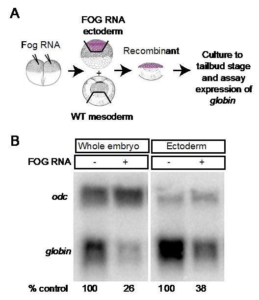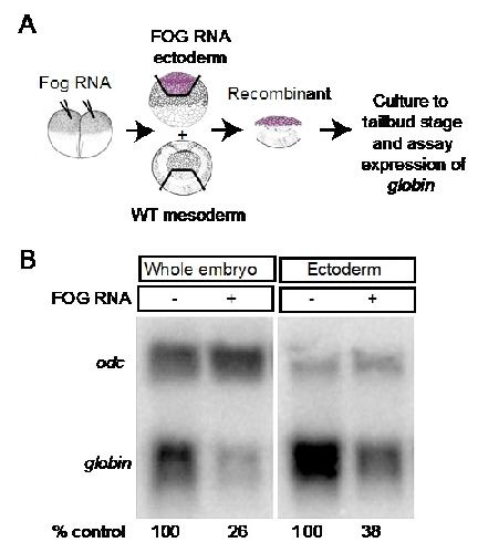 Figure S2. Overexpression of FOG in the ectoderm blocks blood formation. (A) Schematic of ectoderm-mesoderm recombination assay. (B) RNA encoding FOG (250 pg) was injected into each cell of two-cell embryos. At stage 10, ectoderm was explanted from uninjected controls or from embryos injected with FOG RNA. Ectodermal explants were co-cultured with ventral mesoderm explanted from wild type embryos until intact siblings reached the tailbud stage and analyzed for expression of globin by Northern blotting. Levels of globin are normalized to ODC and reported as a percentage of control below each lane. Results were replicated in one additional experiment. |