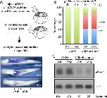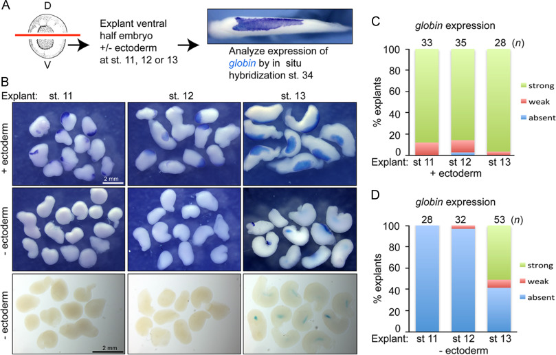 Fig. 1. Signals from the ectoderm are required to induce blood formation in the mesoderm during gastrulation. (A) Illustration of ectoderm removal assay. The ventral half of embryos was isolated and ectoderm was either retained or removed from explants at stages 11, 12 or 13. Explants were allowed to develop until intact siblings reached the tailbud stage (stage 34) and assayed for expression of globin by WMISH. (B) Photographs of representative globin stained explants mounted in PBS (top two rows) or in Murrays clear (bottom row). (C, D) Quantitation of percent of explants expressing globin when cultured in the presence (C) or absence (D) of ectoderm. Results are pooled from 2â3 independent experiments for each group. |