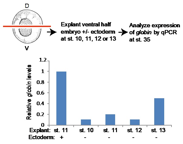 Figure S1. Signals from the ectoderm are required to induce blood formation in the mesoderm during gastrulation. Ectoderm was either retained or removed from embryos at stages 10, 11, 12 or 13. Explants were allowed to develop until intact siblings reached the tailbud stage (stage 33-34) and were assayed for expression of globin by qPCR. Levels of globin in explants lacking ectoderm were normalized relative to that in stage 11 explants in which ectoderm was retained. An identical result was obtained in two out of two experiments. |