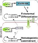 Fig. 8. Model of how GATA2 regulates the balance of Wnt signaling to promote hematopoietic commitment. During normal primitive hematopoiesis, GATA2 induces expression of non-canonical Wnt signaling components, such as Fz4 and Wnt5A in ectodermal cells, and represses expression of the canonical Wnt ligands Wnt4 and Wnt8 in mesodermal cells. Downregulation of canonical Wnt tips the balance away from progenitor proliferation and toward commitment/differentiation. In the mesoderm, this enables progenitors to commit to a hematopoietic fate. In the ectoderm, we hypothesize that differentiation is required for cells to generate a secondary signal (green arrow and circles) that is transmitted to mesodermal cells, enabling them to commit to a blood fate. |