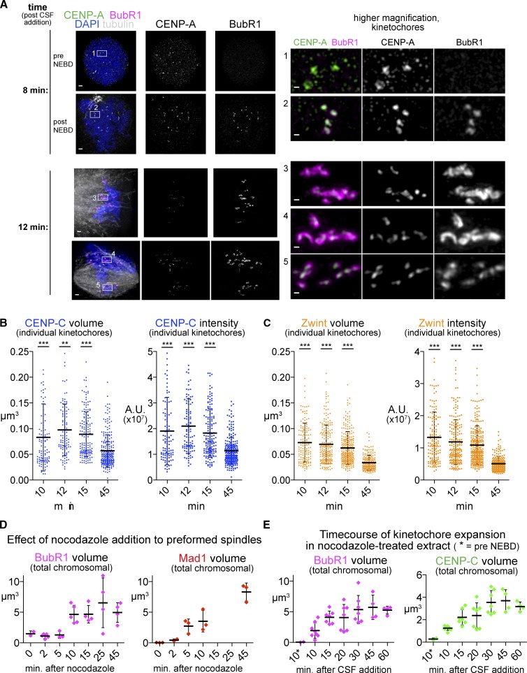 Figure 3. The kinetics of expansion. (A) Examples of kinetochore staining at time points shortly after nuclear envelope breakdown (∼10 min after addition of fresh CSF extract to induce M phase entry). (left) Images of two nuclei at each time point to illustrate the types of figures seen at that time point. Bars, 1 µm. (right) Higher magnification images of a group of kinetochores from each nucleus. Note that after 8 min, small amounts of BubR1 have loaded only in nuclei that have lost their circularity and have presumably completed nuclear envelope breakdown (NEBD). In contrast, after 12 min, much more BubR1 staining can be seen, particularly in kinetochores in locations where the spindle is more disorganized (inset 3 and 4; bars, 0.2 µm). All images are maximum intensity projections of 3D-SIM datasets. (B and C) Quantification of individual kinetochore signals for the indicated protein over a time course during spindle assembly. Significance relative to the 45-min value. Mann–Whitney test: ***, P < 0.001; **, P < 0.01. n > 100 kinetochores from 5–8 nuclei. (D and E) Quantification of total signal from chromosome clusters for the indicated kinetochore component over a time course to indicate the rate of kinetochore expansion. Mean and standard deviation are plotted in black. A.U., arbitrary unit. |