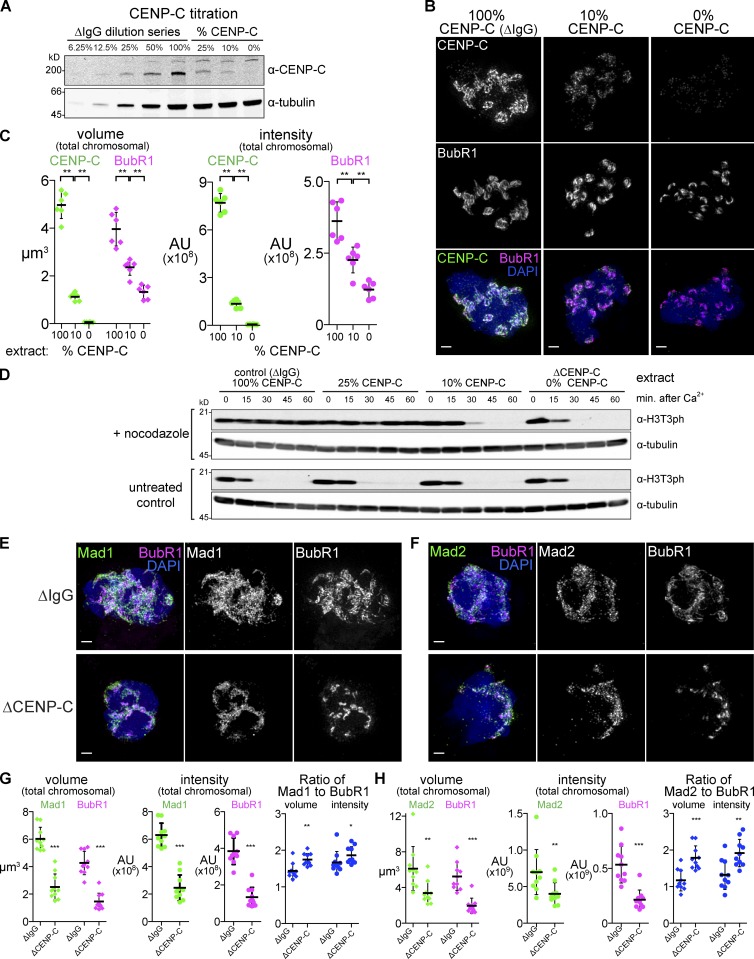 Figure 5. CENP-C–dependent kinetochore expansion supports the SAC signal. (A) Extracts were immunodepleted of CENP-C and mixed with control extract to produce intermediate levels of CENP-C. (B) Mitotic chromosomes assembled in CENP-C titration extracts shown in A and treated with nocodazole. Bars, 1 µm. (C) Quantification of total signal for samples as in B. (D) Extracts described in A were assayed for checkpoint activity by challenging M-phase extract to cycle into interphase upon addition of calcium, which does not occur over 60 min in control extracts but occurred after 30 min in extracts with 10% and more rapidly in extracts with 0% of endogenous CENP-C. Cell cycle state was monitored by the presence of phosphorylated Threonine 3 of Histone H3 (H3T3ph). (E and F) Mitotic chromosomes assembled in nocodazole-treated control (ΔIgG) or CENP-C–depleted (ΔCENP-C) extracts and stained for the indicated checkpoint protein. (G and H) Quantification of total signal from E and F. Mean and standard deviation in black. Mann–Whitney test: ***, P < 0.0005; **, P < 0.01; *, P < 0.05. All images are maximum intensity projections of 3D-SIM datasets. AU, arbitrary unit. |