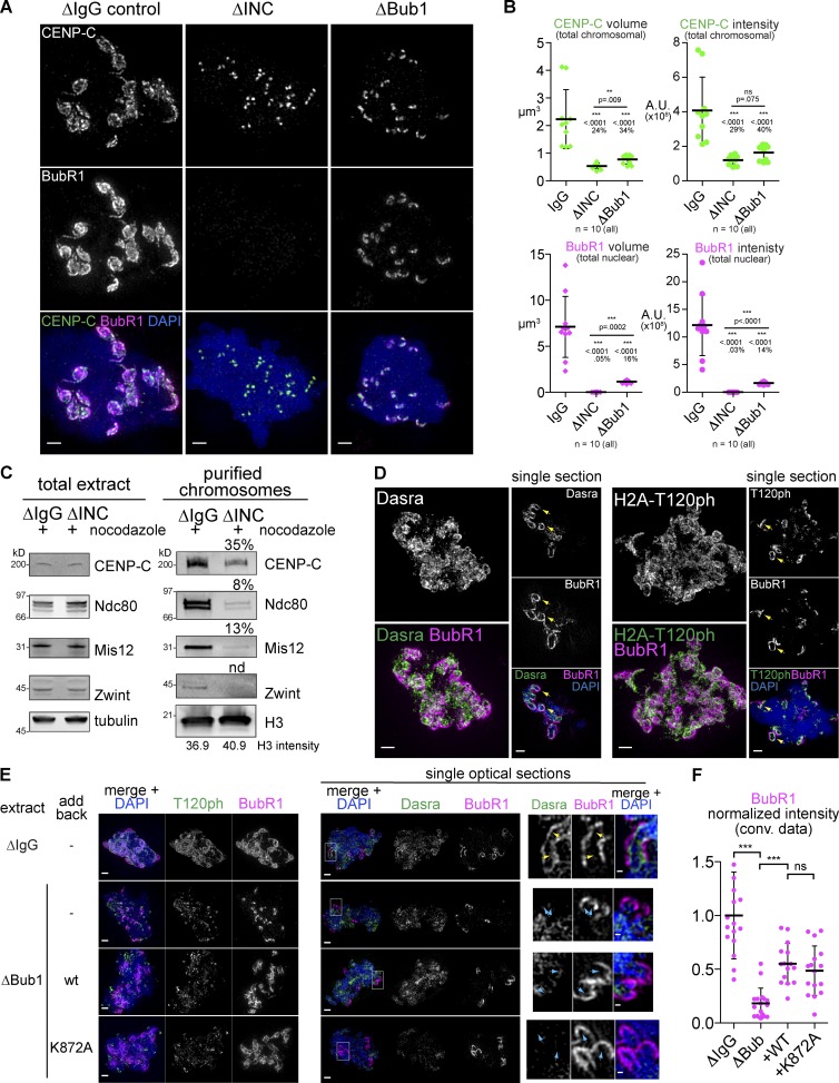 Figure 6. Aurora B is required for the core outer kinetochore, whereas Bub1 is specifically required for the expandable module. (A) Mitotic chromosomes assembled in Xenopus egg extracts immunodepleted of Bub1 kinase (ΔBub1) or the CPC using antibodies recognizing INCENP (ΔINC) and treated with nocodazole. (B) Quantification of the total signal, P values from Mann–Whitney test, and percentage of control mean value are shown. A.U., arbitrary unit. (C) Western blots of total extract (left) and chromosomes purified from nocodazole-treated control (ΔIgG) or CPC-depleted (ΔINC) extracts (right) show a reduction in CENP-C and a more severe loss of Ndc80, Mis12, and Zwint signal. (D) Mitotic chromosomes assembled in nocodazole-treated extracts. (left) Maximum intensity projections of whole nuclei. (right) Single optical section from the same dataset to highlight the inner centromeric staining underlying the expanded kinetochores (yellow arrows). (E) Mitotic chromosomes assembled in indicated extracts. Higher magnification images of a single optical section within the chromosome mass of Dasra-stained samples (area of inset shown with white boxes) are shown in the right-most panels to highlight the mislocalization of the CPC in all Bub1-depleted nuclei (cyan arrows) relative to controls (yellow arrows). wt, wild type. (F) Quantification normalized to the intensity of the BubR1 staining in control depletion (ΔIgG). Mean and standard deviation plotted in black. Mann–Whitney test: ***, P < 0.0001; ns, P = 0.28. All images are maximum intensity projections, except when “single section” is indicated, of 3D-SIM datasets. Bars: (A, D, and E, left) 1 µm; (E, right) 0.2 µm. |