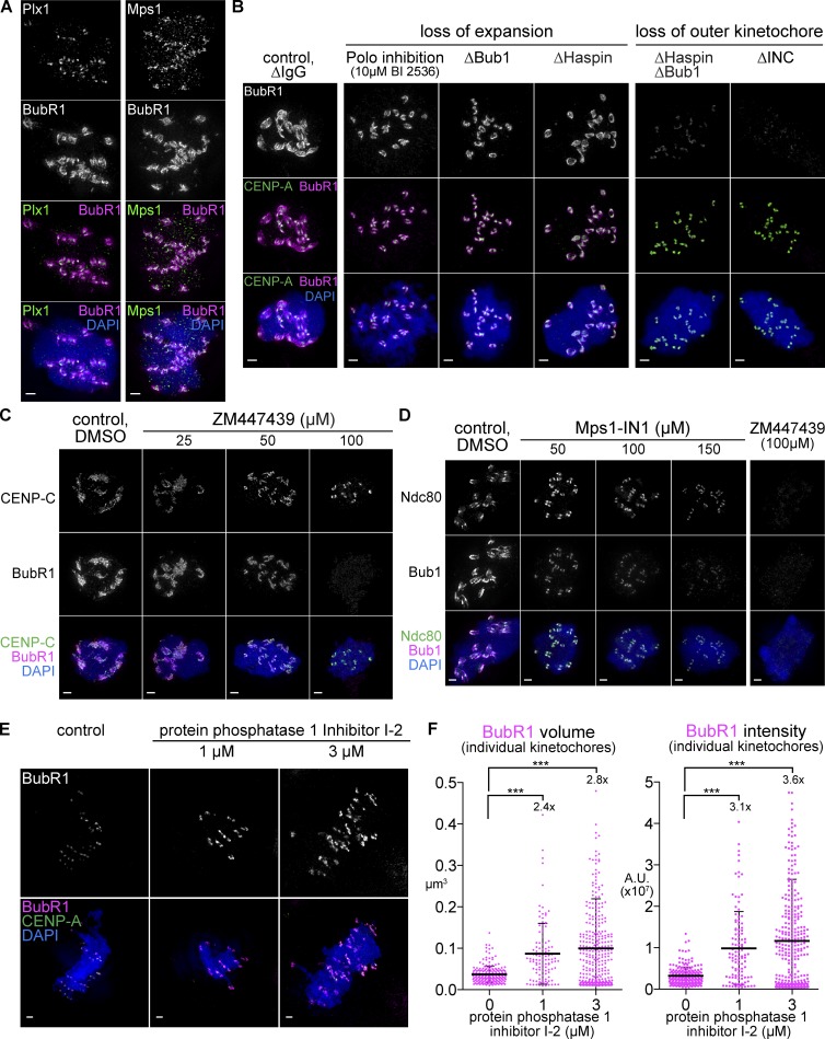 Figure 7. A balance of kinase and phosphatase activity tunes the extent of expansion. (A–D) Mitotic chromosomes assembled in the indicated nocodazole-treated extract. (E) Mitotic spindles assembled in extracts treated with 1–3 µM PP1 inhibitor I-2 and processed for immunofluorescence against BubR1 (top, white; bottom, magenta). (F) Quantification of BubR1 signal for individual kinetochores, mean, standard deviation, and fold change in black. Mann–Whitney test: ***, P < 0.0001. All images are maximum intensity projections of 3D-SIM datasets; bars, 1 µm. A.U., arbitrary unit. |