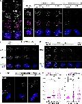 Figure 1. Kinetochores expand by forming micrometer-scale fibrous structures that extend throughout the chromosome mass in the absence of microtubules. (AâD) Comparison of mitotic chromosomes and kinetochores in human RPE-hTERT cells (A and B) and Xenopus egg extracts (C and D) in the presence (right) or absence (left) of 33 µM nocodazole to completely depolymerize microtubules (not depicted). Each image represents a set of chromosomes derived from a single nucleus. Centromeres are stained (green) with CREST antisera (A and B) or CENP-A (C and D) and costained for the outer kinetochore protein BubR1 (magenta) and DAPI (blue). All chromosomes (A and C; bars, 1 µm) and blowups of sister centromeres (B and D; bars, 0.2 µm) are shown at the same magnification to allow size comparison. (B and D) Colored arrows indicate lengths of maximum BubR1 signal perpendicular to the centromereâcentromere axis (magenta) and the distance between centroids of centromere signals (green). White arrows indicate length measurements of traces along the filamentous structure beginning from the centroid of the nearest CENP-A focus. (E) Quantification of the total kinetochore staining on the chromosome cluster. Mean and standard deviation plotted in black. Mean values and fold change indicated above. MannâWhitney test: ns, P > 0.5; *, P < 0.05; **, P < 0.01; ***, P < 0.001 (n = 4â10 nuclei). (F) Staining of KMN network components (green) in nocodazole-treated extracts costained with BubR1 (magenta, chromosomes not depicted). Bars, 1 µm. All images are maximum intensity projections of 3D-SIM datasets. A.U., arbitrary unit. |