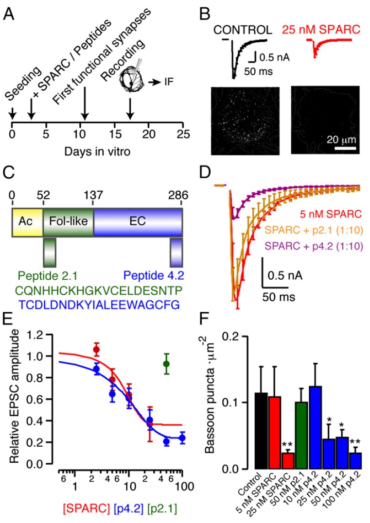 (F) Summary of SPARC-derived peptides on the density of bassoon puncta