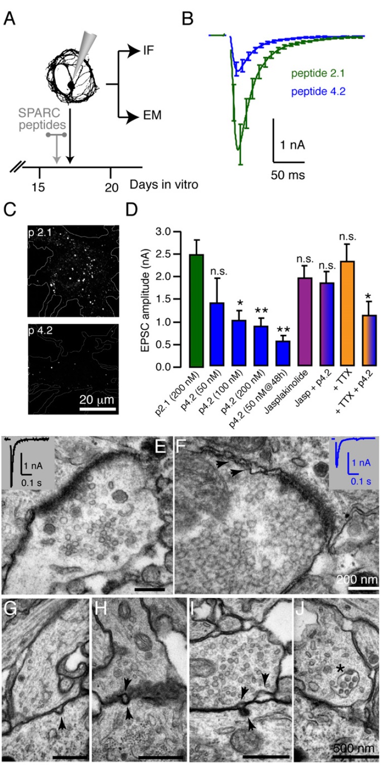 SPARC + 50 nM p4.2 (n = 29). (E) Relative decay in EPSC amplitude as a