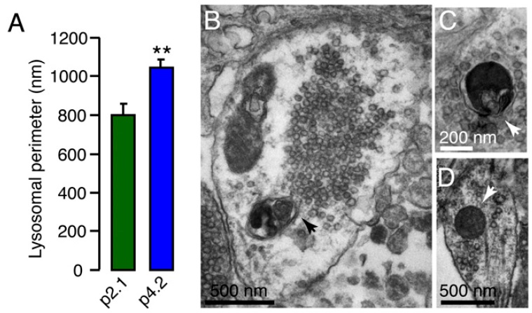 terminal treated with p4.2 (arrow). (C) A secondary lysosome formed by