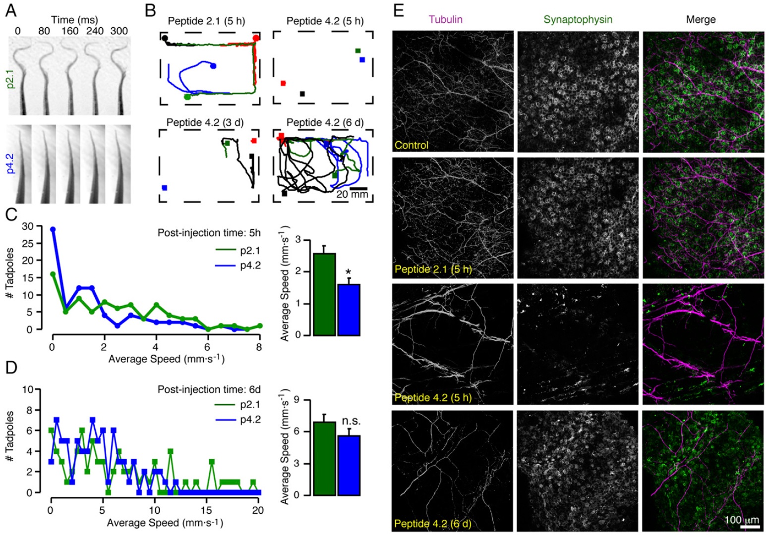 (C) Distribution and mean average speed (mean ± SEM; P < 0.01) of tadpoles at 5 h after injection with p2.1 (n = 80) or p4.2 (n = 80). (D) Same as C but at 6 d after