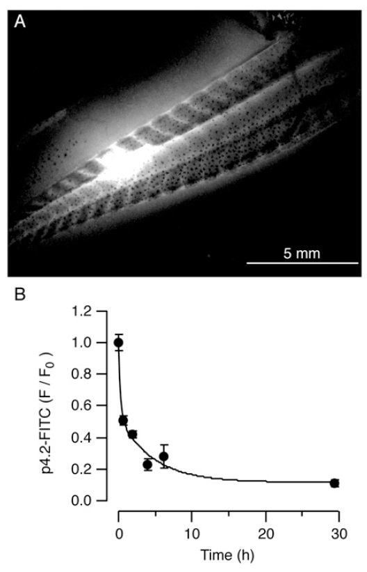 Fig. S5. Estimated p4.2 clearance from X. tropicalis tadpoletail obtained by injecting peptide conjugated to FITC. (A) Diffusion to distaltail regions was
