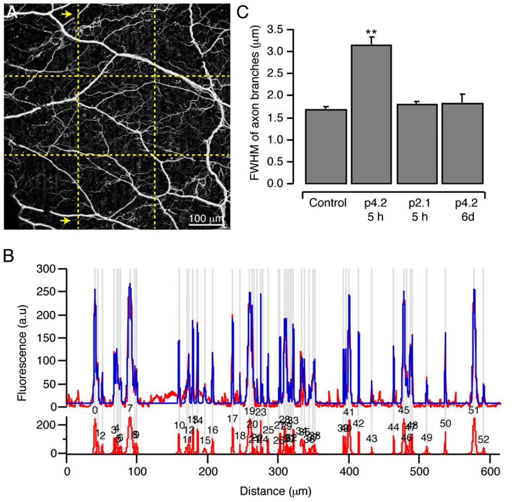 the width of axon branches was obtained by measuring interceptions with four lines covering the whole image (yellow). The image is a 620 à 620 μm Z-stack