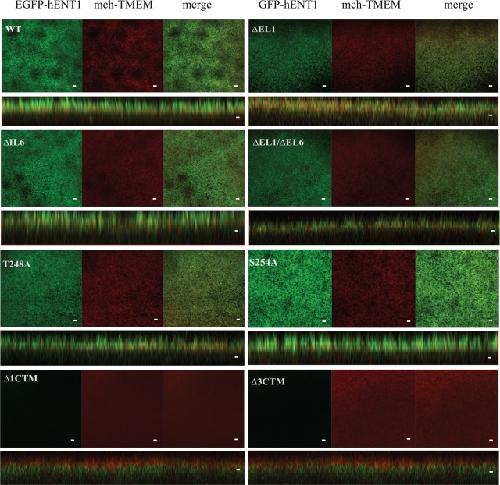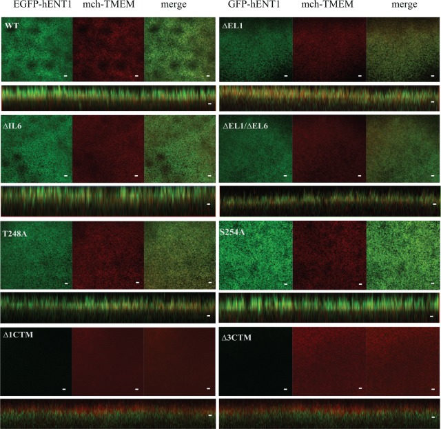 Fig 2. Plasma membrane localization of hENT1 variants.Fluorescent confocal microscope images of WT hENT1, ∆EL1, ∆IL6, and ∆EL1/∆IL6 loop deletion mutants, T248 and S254A point mutants, and ∆1CTM and ∆3CTM carboxyl-terminus deletion mutant expressed in X. laevis oocytes. Constructs are indicated on the panels. The individual images along the focal plane of the microvilli on the membrane (EGFP in green, mch-TMEM in red) are shown, followed by the merge of EGFP and mch-TMEM in (yellow). Orthogonal sections through Z stacks also show co-localization. Carboxyl-terminal deletions did not show EGFP fluorescence on the membrane. Images are representative of 30 oocytes. Scale bar = 5μm.