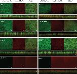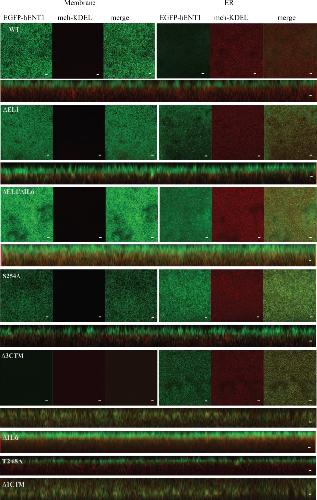 Fig 3. Intracellular distribution of the hENT1 variants.Shown are the confocal images for WT hENT1, ∆EL1, and ∆EL1/∆IL6 loop deletion mutants, S254A point mutant, ∆3CTM carboxyl-terminus deletion mutant expressed in X. laevis oocytes. Two images were taken: one on the plasma membrane (left panel) and the other deep within the cell showing the ER structure (right panel). Only the orthogonal sections are shown for ∆IL6, T248A and ∆1CTM. Left panel shows normal distribution of EGFP (green) on the membrane and mch-KDEL (red) in the ER for the WT, T248A and S254A. In contrast, ∆EL1, ∆IL6, ∆EL1/∆IL6 shows some co-localization of hENT1 and KDEL in the ER. Carboxyl-terminal deletions did not show EGFP fluorescence on the membrane. Instead, EGFP was present within the ER, co-localized with mch-KDEL. All the confocal images show a single, representative, section of a Z-series taken through the entire cell. Images are representative of 30 oocytes. Scale bar = 5μm.