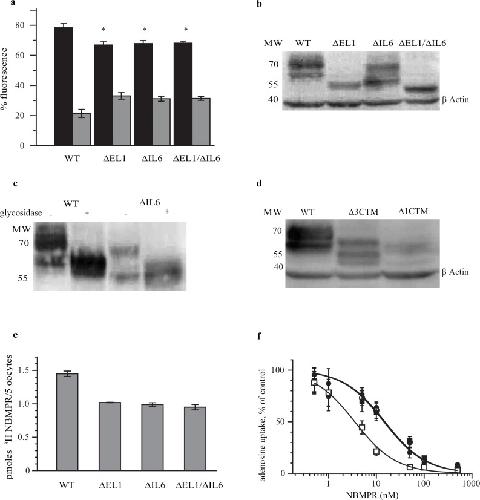 Fig 4. hENT1 loop deletion mutants show similar sub-cellular distribution and susceptibility to NBMPR inhibition.(a) Fraction of intra- and extra-cellular distribution of EGFP-hENT1 variants. Confocal images shown in Fig 2 were quantified and the fluorescence in the ER and plasma membrane expressed as percent of the total fluorescence. Shown are means and SE for 30 oocytes. * p<0.05. The black and grey bars represent the extra and intracellular fluorescence respectively. (b) The total protein expression assessed by Western blot. 100 μg of proteins were loaded in each lane. The EGFP-hENT1 fusion proteins were visualized using EGFP monoclonal antibody. Constructs are shown above the lanes. (c) Western blots showing deglycosylation of the WT and âIL6 mutant. 100 μg of the proteins were incubated with and without deglycosylase for 4 hr at 37°C. (d) Western blots for carboxyl terminal deletions. 400 μg of the WT, â3CTM and â1CTM deletions were loaded in each lane and visualized with EGFP monoclonal antibody. The migration positions of the molecular weights standards are indicated in panelâs b-d. Actin was used as the internal control to show equal loading in lanes b and d. (e) Quantification of NBMPR binding sites. Oocytes were injected EGFP-hENT1 RNA were incubated for 48 hrs prior to addition of 500 nM 3H NBMPR for one hr. Radioactivity retained by washed oocytes was measured and corrected for background. Values are expressed as mean ± SE for 5 oocytes for 3 independent experiments done in triplicate. (f) Adenosine uptake after NBMPR inhibition. Values corrected for background are expressed as mean ± SE for 5 oocytes for 3 independent experiments done in triplicate. Shown are WT (closed circles), âIL1 (open circles), âIL6 (closed squares), and âEL1/âIL6 (open squares).
