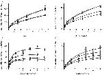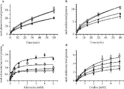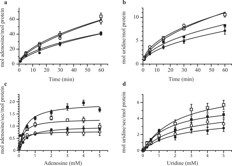 Fig 5. hENT1 deletion mutants show similar substrate uptake.Time dependence of uptake of 5 μM adenosine (a) and uridine (b). Concentration dependence of adenosine (c) and uridine (d) uptake. The incubation time was 1 minute for adenosine and 3 minutes for uridine. Values are corrected for background and expressed as means ± SE for 5 oocytes for 3 independent experiments done in triplicate. Shown are WT (closed circles), âEL1 (open circles), âIL6 (closed squares), and âEL1/âIL6 (open squares).