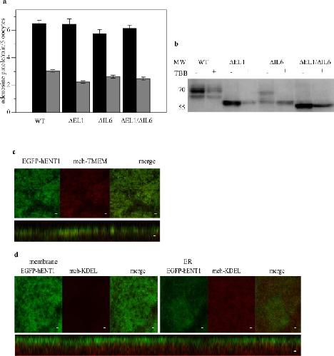 Fig 6. Effect of TBB on the deletion constructs.(a) Uptake of 5 μM 14C-adenosine after 1 minute incubation period without (black) and with (gray) pre-incubation with TBB. Values are expressed as mean ± SE for 5 oocytes for 3 independent experiments done in triplicate. (b) Western blot of the oocytes with and without treatment with TBB probed with EGFP monoclonal antibody. (c) Confocal images of oocytes co-injected with RNA expressing WT EGFP-hENT1 and mch-TMEM after treatment with 25 μM TBB for 12 hr. (d) Confocal images of oocytes co-injected with RNA expressing WT EGFP-hENT1 and mch-KDEL. Images were taken along the plane of the microvilli (left) and within the ER (right).